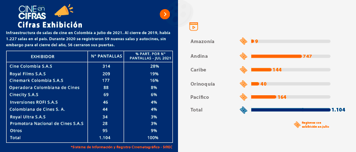 Infraestructura de salas de cine en Colombia a julio de 2021. Al cierre de 2019, había 1.227 salas en el país. Durante 2020 se registraron 59 nuevas salas y autocines, sin embargo para el cierre del año, 56 cerraron sus puertas.