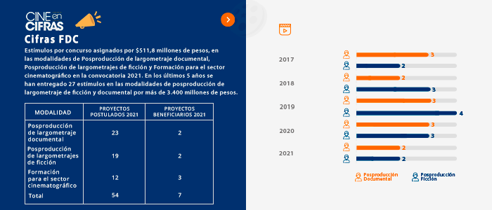 Estímulos por concurso asignados por $511,8 millones de pesos, en las modalidades de Posproducción de largometraje documental, Posproducción de largometrajes de ficción y Formación para el sector cinematográfico en la convocatoria 2021. En los últimos 5 años se han entregado 27 estímulos en las modalidades de posproducción de largometraje de ficción y documental por más de 3.400 millones de pesos.