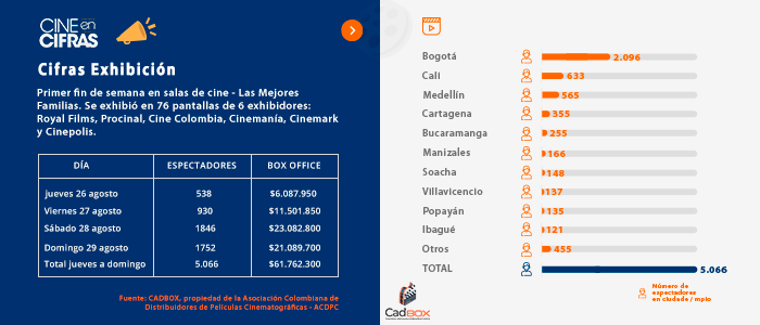 Primer fin de semana en salas de cine - Las Mejores Familias. Se exhibió en 76 pantallas de 6 exhibidores: Royal Films, Procinal, Cine Colombia, Cinemanía, Cinemark y Cinepolis.