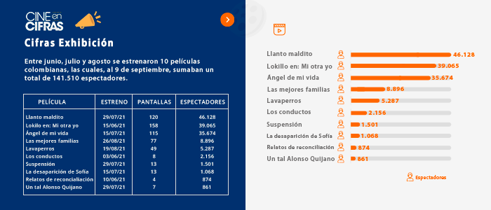 Entre junio, julio y agosto se estrenaron 10 películas colombianas, las cuales, al 9 de septiembre, sumaban un total de 141.510 espectadores.