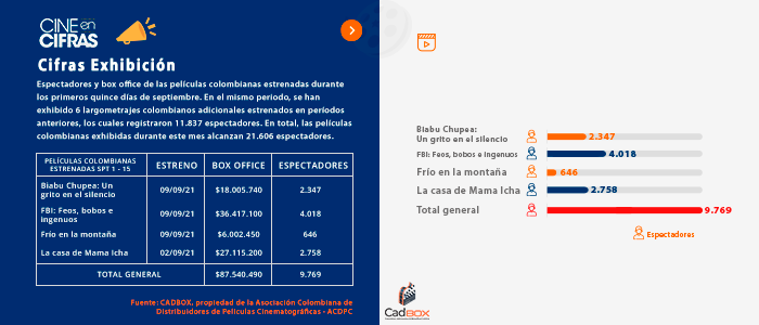 Espectadores y box office de las películas colombianas estrenadas durante los primeros quince días de septiembre. En el mismo periodo, se han exhibido 6 largometrajes colombianos adicionales estrenados en períodos anteriores, los cuales registraron 11.837 espectadores. En total, las películas colombianas exhibidas durante este mes alcanzan 21.606 espectadores.