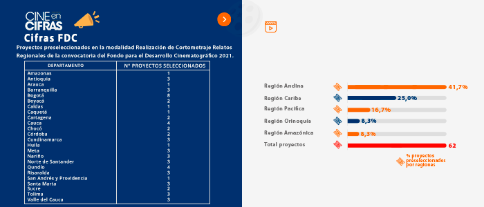 Proyectos preseleccionados en la modalidad Realización de Cortometraje Relatos Regionales de la convocatoria del Fondo para el Desarrollo Cinematográfico 2021.