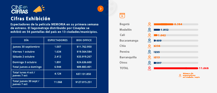 Espectadores de la película MEMORIA en su primera semana de estreno. El lagometraje distribuido por Cineplex se exhibió en 56 pantallas del país en 13 ciudades/municipios.