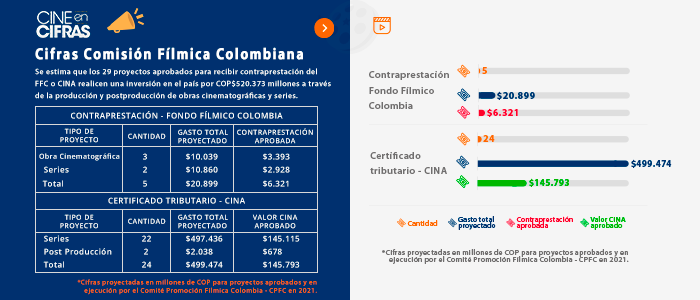 Se estima que los 29 proyectos aprobados para recibir contraprestación del FFC o CINA realicen una inversión en el país por COP$520.373 millones a través de la producción y postproducción de obras cinematográficas y series.