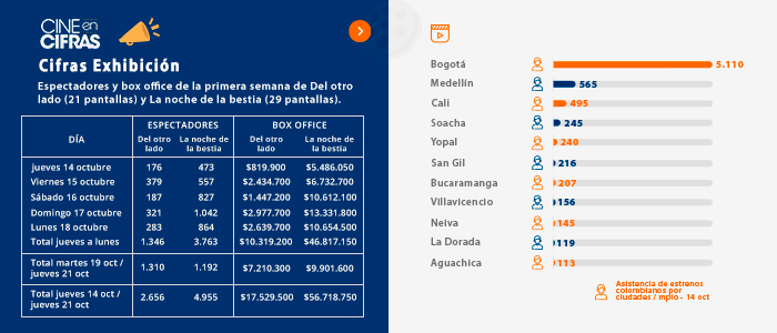 Entre el 14 y el 21 de octubre asistieron 7.611 espectadores a salas de cine. Del otro lado se exhibió en 21 pantallas y La noche de la bestia en 29.