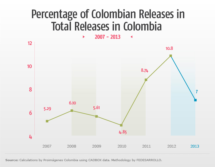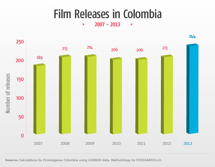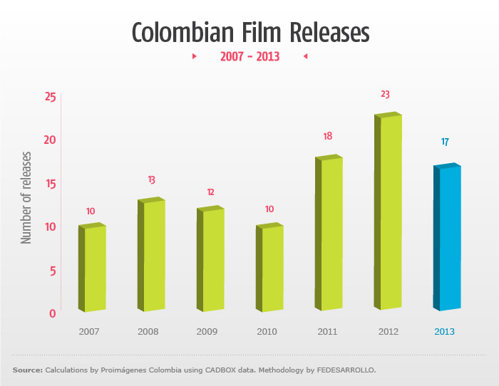 - During 2013, a total of 17 Colombian films were released, six fewer than in 2012, which marked an all-time high for national releases.