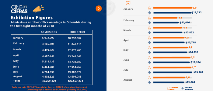 Admissions and box office earnings in Colombia during the first eight months of 2018