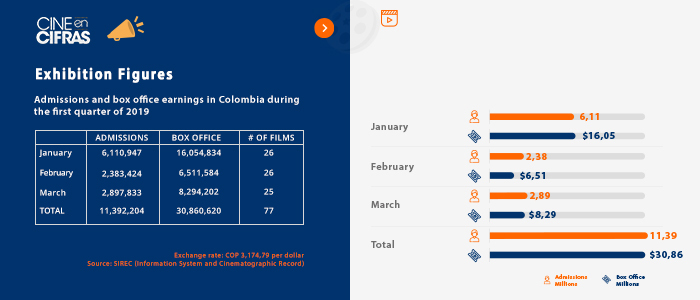 Exhibition FiguresAdmissions and box office earnings in Colombia during the first quarter of 2019