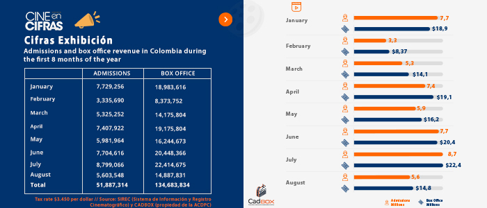 Admissions and box office revenue in Colombia during the first 8 months of the year