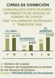 Comparativo espectadores 1° fin de semana y número de copias, cine colombiano1° trimestre 2009